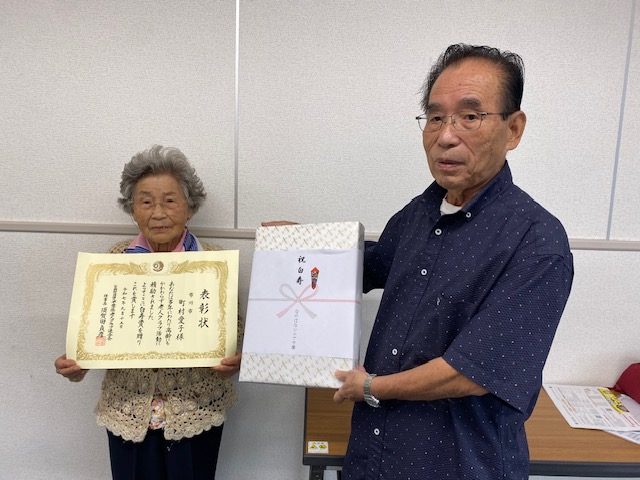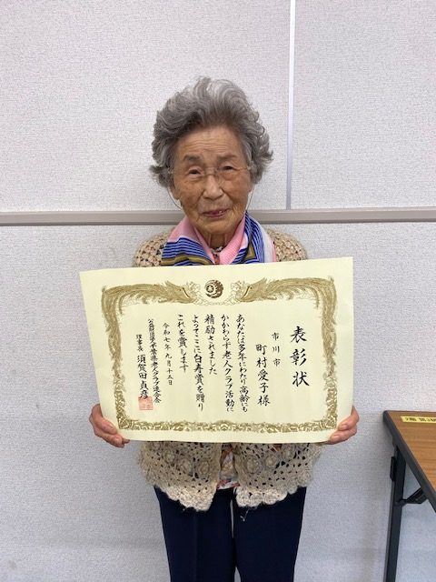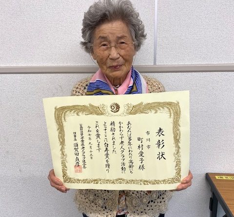 04_08_曽谷いずみ会第二クラブ 未分類 第04部会 白寿賞受賞 2025年10月18日2025年10月18日 第4部会 長年「曽谷いずみ会第二クラブ」の会長を続けられている町村愛子さん、千葉県老連より、白寿賞をいただきました。4部会会長会で賞状を授与。
